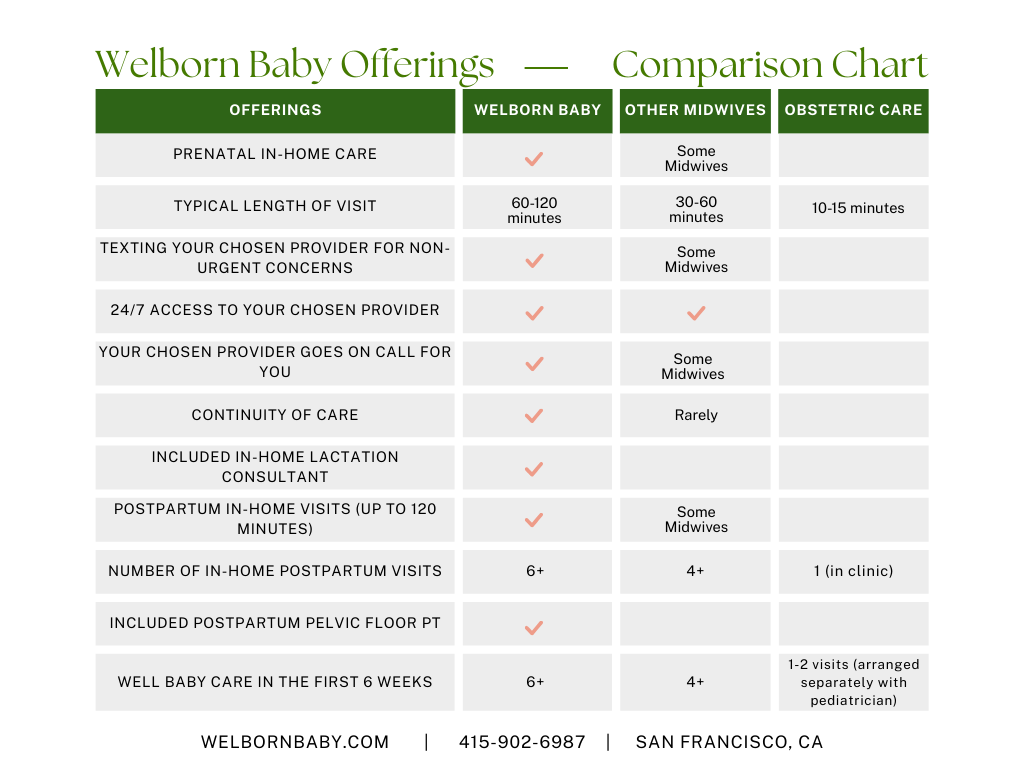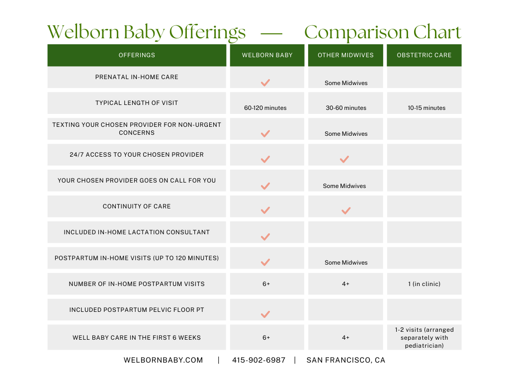I provide a lactation consultant in-home visit with an IBCLC and a postpartum pelvic floor PT assessment for all clients. *I am the only midwife in the entire Bay Area that offers this included in their care
